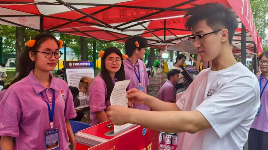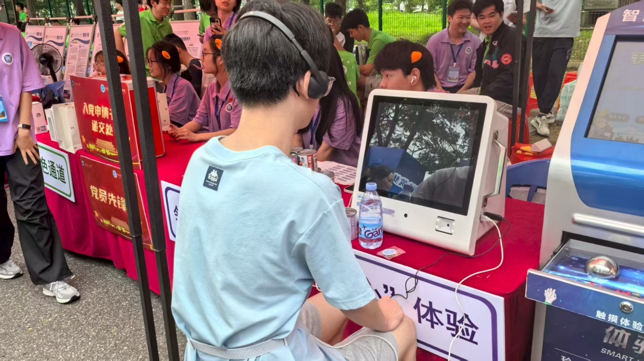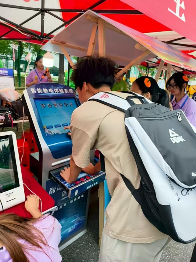 智能化赋能:让安全与心理教育“可触可感”。作为安全应急学院的迎新特色,“AI+心理及安全教育”成为现场首个焦点。活动现场专门设置的“呼吸心情”压力检测设备前,新生们争先恐后体验,设备通过实时监测呼吸频率、心率等数据,直观了解自己初入校园的情绪状态,志愿者们则结合检测结果,为新生提供情绪调节小贴士,帮助他们快速缓解入学焦虑。另一侧的智能模拟触电设备前也挤满了人。不同于传统的理论讲解,该设备通过模拟触电感受,让新生在安全防护措施的保护下,亲身体验触电瞬间的麻木感,深刻认识到用电安全的重要性。