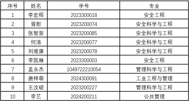 根据《关于2025年研究生国家奖学金评审工作的通知》和《安全科学与应急管理学院研究生奖学金评定实施细则(修订版)》等文件有关要求,经学生本人申请、学院研究生奖学金评审委员会评定,安全科学与应急管理学院2025年硕士研究生国家奖学金拟上报结果公示如下: