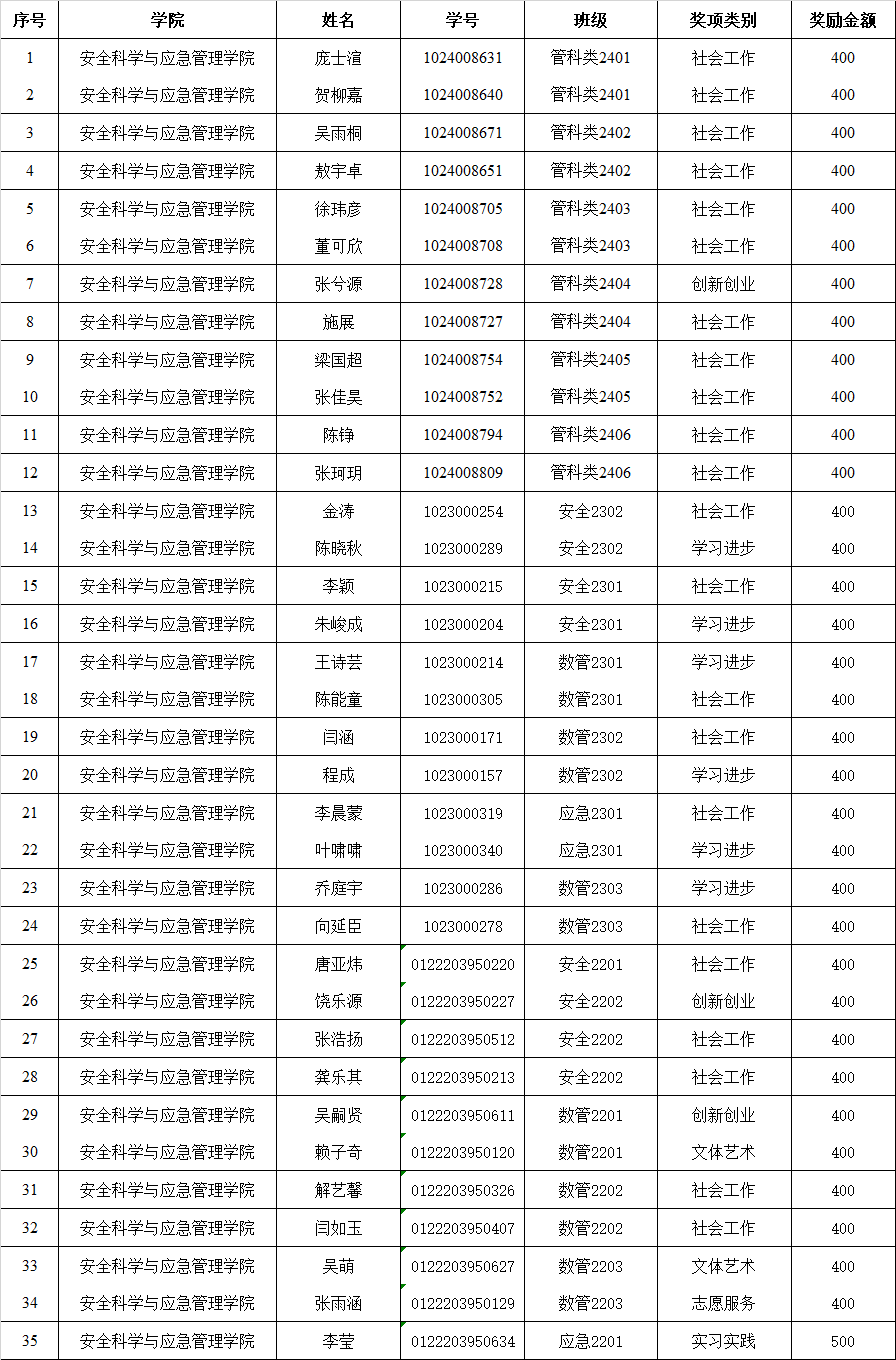 【公示】安全应急学院2024-2025学年单项奖学金拟推荐名单