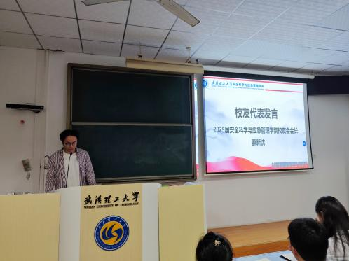 2025届校友会会长薛新忱代表全体校友会成员发言,他诚恳感谢学院的辛勤付出,祝福每位毕业生同学都能在各自的领域和行业发光发热。并表示后续2025届校友会将积极开展丰富多彩的校友活动,加强校友与学院的沟通联系,同时建立健全2025届校友会工作机制,为校友会的长远发展奠定基础。